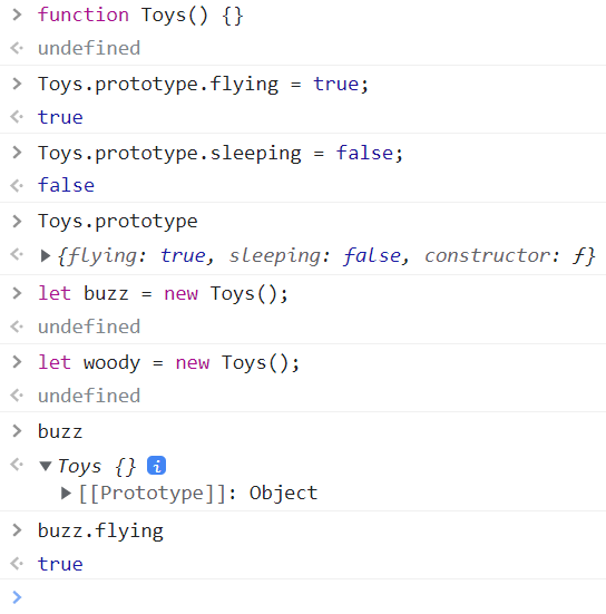 woody๋ buzz์ prototype์ด ๋งํฌ๋์๋ค. woody ๋ด๋ถ์๋ flying์ด๋ผ๋ ํ๋กํผํฐ๊ฐ ์์ง๋ง ์ฐ๊ฒฐ๋ buzz์์ ํด๋น ํ๋กํผํฐ๋ฅผ ์ฐพ์ ๊ทธ ๊ฐ์ ๋ฐํํ ๊ฒ์ด๋ค.