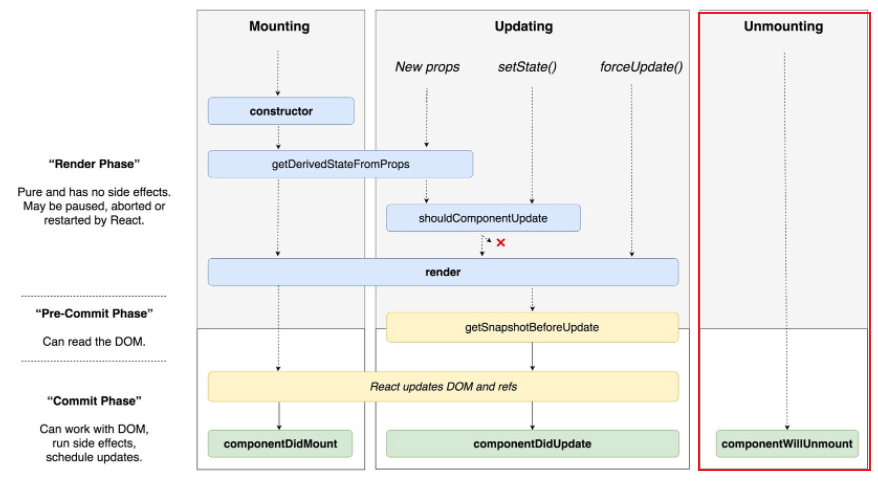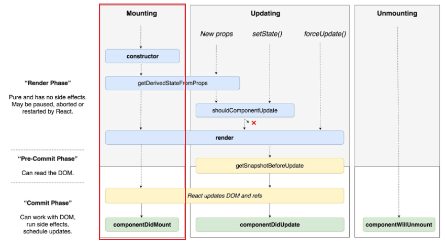 ๋ผ์ดํ ์ฌ์ดํด์ 3๊ฐ์ง Mount, Update, Unmount ์นดํ ๊ณ ๋ฆฌ๋ก ๋๋๋ค. ๊ฐ ๋ถ๋ฅ์ ๋ฐ๋ผ ์ด๋ฒคํธ๊ฐ ๋ฐ์๋๋ ํ์๊ฐ ๋ค๋ฅด๋ค.