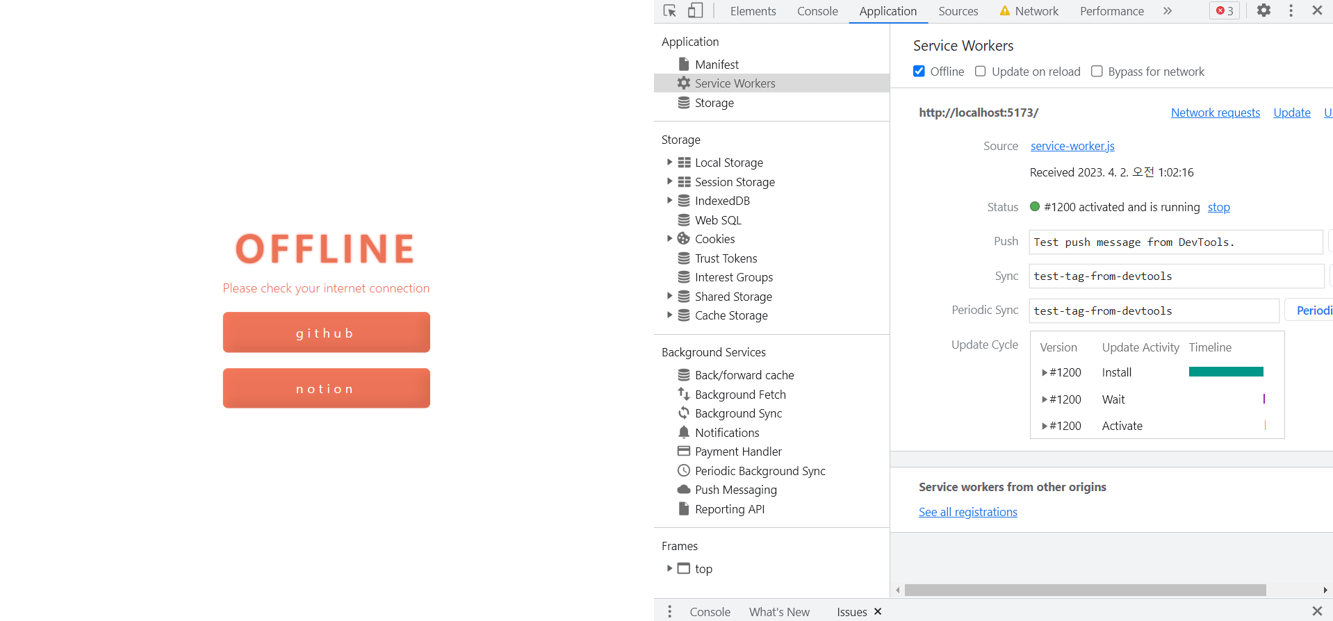 - servise worker: 서비스 워커는 백그라운드에서 실행되는 스크립트이다. 네트워크와 관련된 요청의 처리를 돕는다.