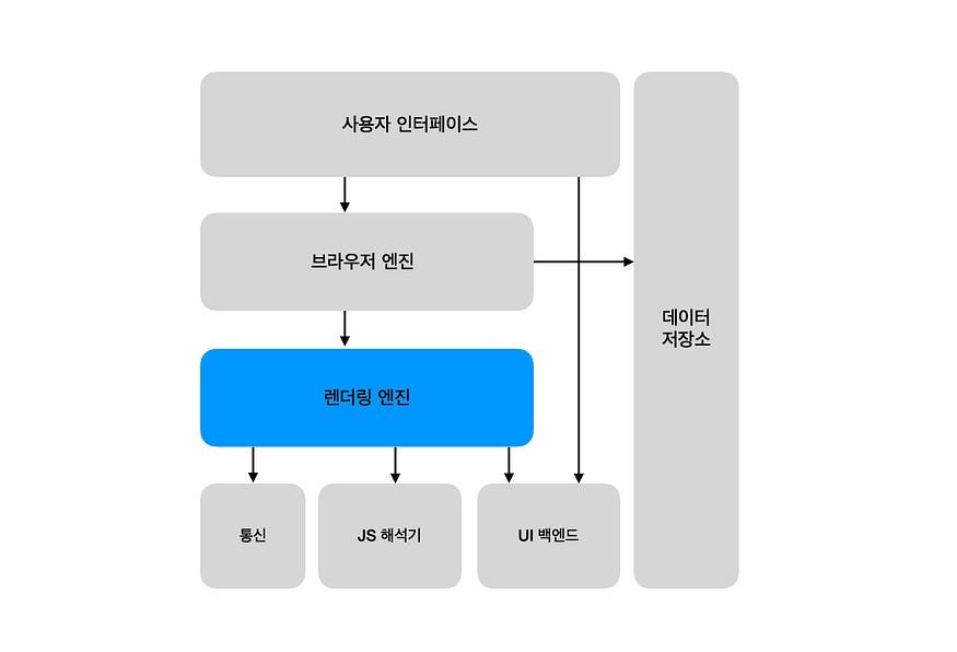 - 브라우저 엔진은 렌더링 엔진과 사용자 인터페이스 사이의 상호작용을 처리한다.